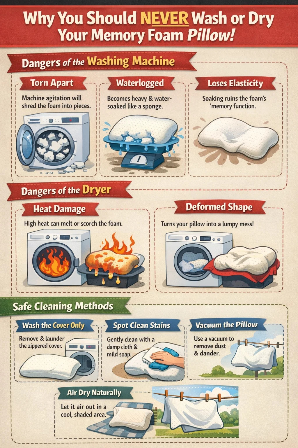 Het directe antwoord is: doe dit absoluut niet! Terwijl je gooit kussen van traagschuim rechtstreeks in de wasmachine en droger plaatsen lijkt misschien moeiteloos en hygiënisch, maar deze handeling "vermoordt" praktisch uw kussen. Dit is waarom je deze twee machines en enkele betrouwbaardere reinigingsmethoden zeker moet vermijden: