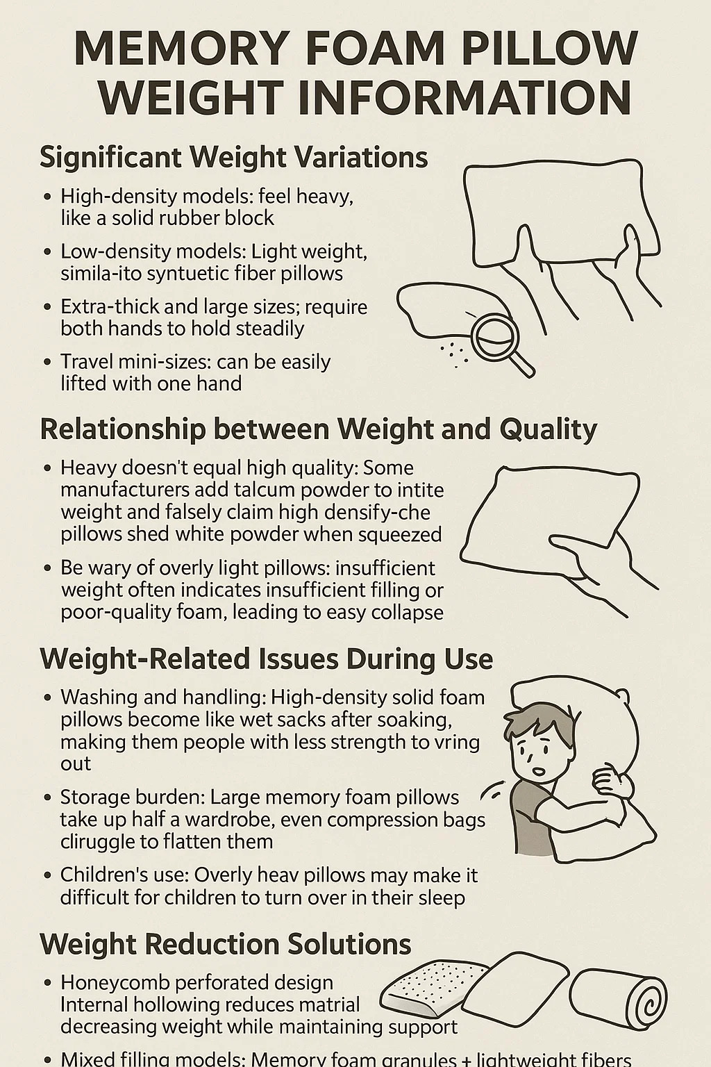 Zwaar is niet hetzelfde als hoge kwaliteit: sommige fabrikanten voegen talkpoeder toe om het gewicht te verhogen en beweren ten onrechte een hoge dichtheid; deze kussens werpen wit poeder af als ze worden samengedrukt.